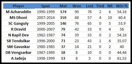 Mohammad Azharuddin still tops the list for most ODIs captained for India. He also has a respectable win ratio of 54%, which is comparatively better than most his peers.