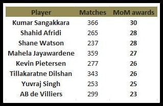 Sri Lankan wicket keeper batsman leads the way with 30 man of the match awards since late 2004 in all international matches. Shahid Afridi and Shane Watson have received 28 awards each.