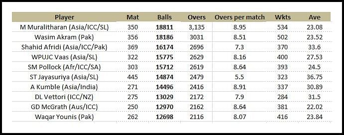 Muttiah Muralitharan has delivered an astounding 18,811 balls in his ODI career, bowling approximately 9 overs every match he has played in, confirming his status as the mainstay of the Sri Lankan bowling attack for close to two decades.