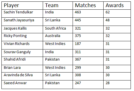 A List of players who have won man of the match award most number of times in One Day International matches.