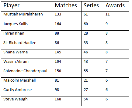 A List of players who have won man of the series award most number of times in Test matches.