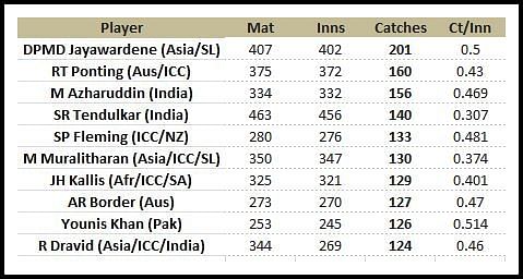 Mahela Jayawardene leads the way with 201 catches. Here is the top 10 list of players with the most number of catches in One Day Internation cricket.