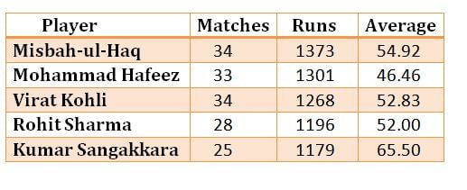 Here is a list of players who have scored the most number of runs in One-Day international cricket in 2013. All the top 5 spots are occupied by Subcontinental players. Misbah-ul-Haq, who has had a phenomenal year as a captain and a batsman in this format of the game, tops the list.