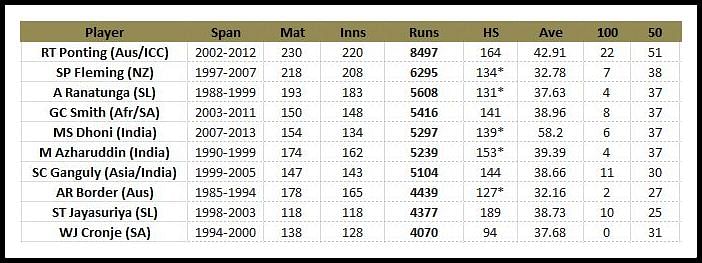 Arguably the greatest captain of his generation, Australia’s Ricky Ponting is also the most successful skipper with the bat. Three Indians make it to the list with MS Dhoni the most successful Indian captain with a staggering average of 58, head and shoulders above the rest.
