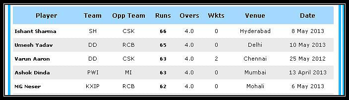 Here is the list of five players who have conceded the most number of runs in an innings in the Indian Premier League. Four of the top five happen to be Indian players, which is not actually surprising, given the standard of bowling in India.