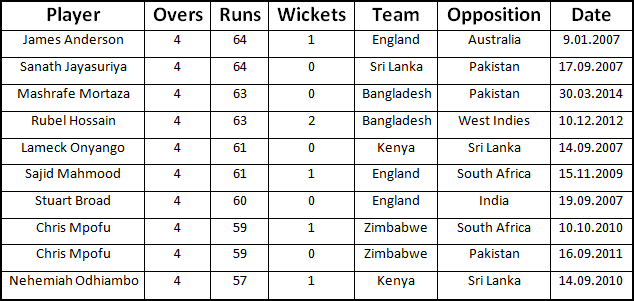 The list below reveals the most number of runs conceded in an innings in T20 internationals.