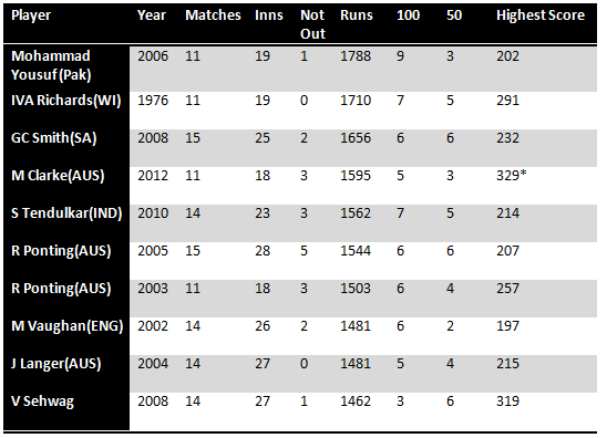 This table lists out the maximum runs scored by a cricketer in a calendar year in Test matches: