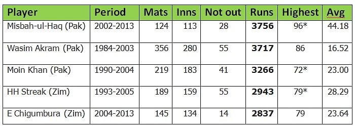 This table lists the highest number of runs scored by a batsmen in ODI cricket, without reaching a hundred. Its really interesting to find Misbah-ul-Haq heading this list, as he has probably been the most consistent Pakistani batsman over the past five years. Also interesting to see, the top three in the list are all from Pakistan.