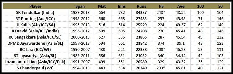 Sachin Tendulkar expectedly leads the way with a lead of just under 7000 runs over Ricky Ponting. Rahul Dravid is the only other Indian on the list, in 4th place.