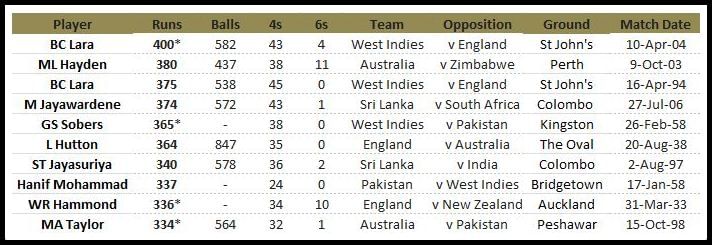 Brian Charles Lara holds the record for the most runs in an innings with 400 not out. The legendary West Indian created history against England by becoming the first to 400 since the inception of the game. He also has the third highest score ever of 375 against the same opposition. No Indian features in the top 10 list.