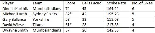 Its the pinch hitters that make T20 games so entertaining. They lighten the mood with their brilliant knocks.Here’s a list of the top five players that scored the most number of sixes in a single inning of a Champions League T20 match.