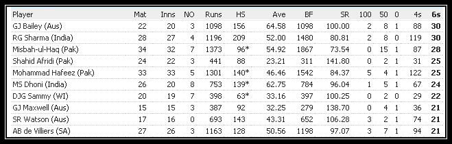 Australian batsman George Bailey and the current Indian opener Rohit Sharma are joint-top in the list of batsmen with the most number of sixes in One-Day internationals in 2013. Both of them had hit 30 sixes. Out of the 30 sixes by Rohit, 16 had come from a single match, in which he scored his highest individual score of 209 in ODIs.
