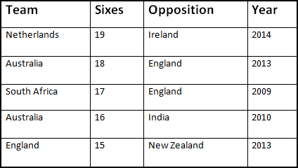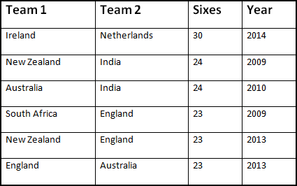 Lists of most number of sixes in an innings and in a match is given below. Netherlands has hit the most number of sixes in an innings against Ireland, 19 in today’s match. Also today’s encounter between these two teams saw the most number of sixes in an entire match, 30.