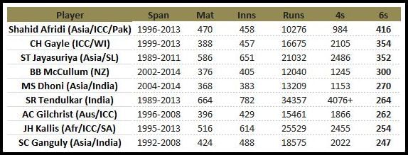 Destructive right handed Pakistani batsman Shahid Afridi, not surprisingly, holds the record for most sixes in international cricket. However, hard hitting West Indian Chris Gayle, who comes in close at second, has a great chance of overtaking Afridi, having played considerably lesser number of games.