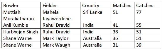 Here is a list of most successful bowler and fielder combinations in the history of Test cricket. Having been involved in 77 dismissals, Sri Lankan pair of Muttiah Muralitharan and Mahela Jayawardene top the list.