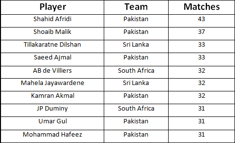 Pakistani all-rounder Shahid Afridi has won the most number of T20 games, 43. He is followed by a series of other fellow Pakistani players. Sri Lanka’s Dilshan and Jayawardene and South Africa’s Jacques Kallis and AB de Villiers also features in this list.