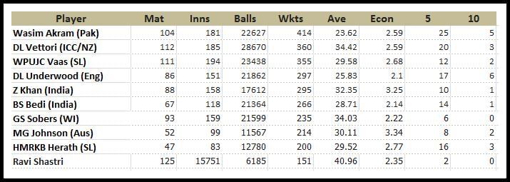 Pakistani great, Wasim Akram leads the way, with former New Zealand captain, Daniel Vettori in second. Only two Indians make the list – Zaheer Khan and Ravi Shastri.