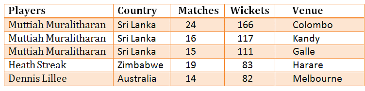 Here is a list of players with the most number of Test wickets on a single ground. Having taken more than 100 wickets in three different venues, Sri Lankan off spinner Muttiah Muralitharan tops the list.