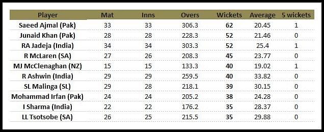 Pakistani Saeed Ajmal proved why he is one of the premier spinners in the world topping the ODI wicket taking charts in 2013. His team mate Junaid Khan follows in second. Three Indians – R Jadeja, R Ashwin and Ishant Sharma make it to the list of top 10.