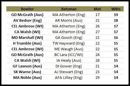 Most bowlers have their ‘bunny’ in cricket who they thrive against. Here is a list of those bowlers who dismissed a single batsman most number of times in Tests. Glenn McGrath has dismissed Michael Atherton a record 19 times in 17 matches.