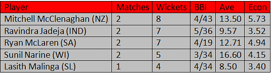 Mitchell McClenaghan has been the surprise package in this tournament so far. With so many established star bowlers missing this tournament the New Zealand pacer has grabbed the opportunity to shine and has picked up eight wickets in two games. He is closely followed by India’s Ravindra Jadeja, who is on seven wickets, thanks largely to his five-wicket haul against West Indies.