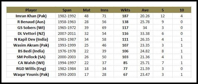 Arguably the greatest swing bowler in the history of the game, Pakistan skipper Imran Khan tops the list by a mile. Australian legend Richie Benaud makes it to second, while West Indies all rounder Gary Sobers is in third. Two Indians, Kapil Dev who lead India to its maiden World Cup, and a surprise entry of left arm spinner Bishen Singh Bedi in 7th.