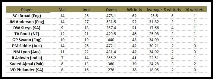 Stuart Broad topped the list for the most wickets picked up in 2013 in Test match cricket. England team mate James Anderson came close in second, while R Ashwin is the only Indian to make the list.