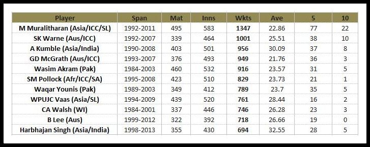 Muttian Muralitharan has an astounding 1347 international wickets to his name at an impressive average of just 22.86. Fellow spinner Shane Warne follows with 1001 scalps. Two Indians, Anil Kumble and Harbhajan Singh make it to the list.