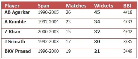 This table shows the top 5 wicket takers for India against Zimbabwe in ODIs. Ajit Agarkar leads the table with 45 wickets in just 26 matches and Kumble is the only spinner among the top 5.