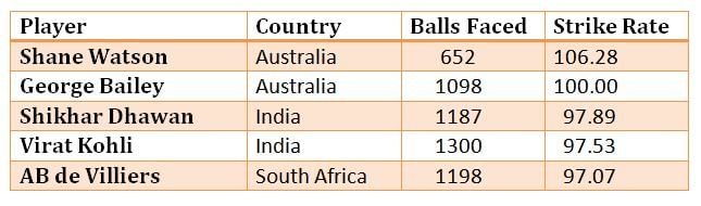 Here is a list of One-Day international players with the best batting strike-rate in 2013. Only batsmen who have faced a minimum of 500 deliveries are taken into consideration. Australian all-rounder Shane Watson tops the list with a strike-rate of 106.28.