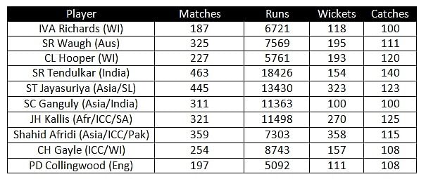 Only ten players have scored 5000 runs, taken 100 catches and 100 dismissals or more in one-day international history. Here is the complete list: