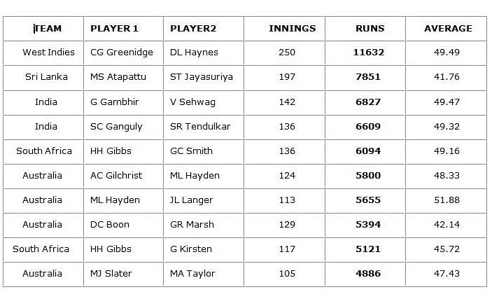 In any match, the openers play a very important role, as they have to set the platform for other batsmen. Let’s take a look through the 10 best opening pairs who have the highest overall partnerships.