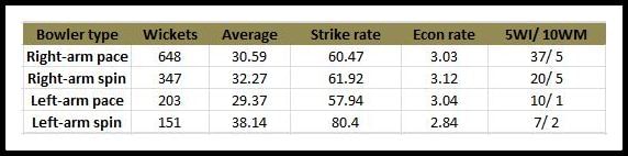 Right arm pacers were the most successful in terms of wickets, however, the left arm fast bowlers had the best average and strike rate in the group.