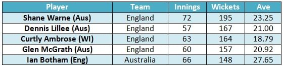 Shane Warne has picked up 195 wickets against England. It is the most number of wickets by any player against one opposition in Test cricket. Next in the list is Dennis Lillee with 167 wickets against England. Here’s the list of Top 5 players: