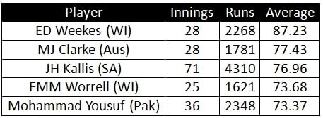 Michael Clarke averages 77.43 in drawn Tests. His average is the second highest, next only to Everton Weekes. Here’s the list of Top 5 players with highest average: