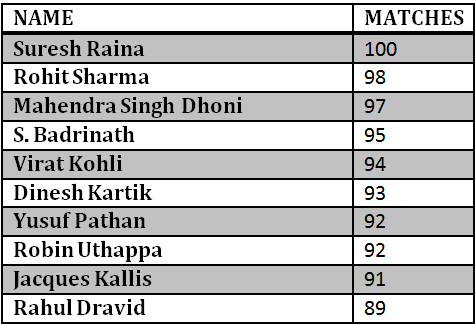 CSK star batsman Suresh Raina has become the first player to play 100 matches in the Indian Premier League (IPL). Having played all his matches for Chennai Super Kings in IPL, Raina is closely followed by Rohit Sharma, who has played 98 matches in IPL.
