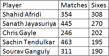 Chris Gayle during his 109 run innings yesterday, against Sri Lanka, hit seven sixes; as a result he reached third in the list of players with most sixes in ODI cricket. Shahid Afridi tops the list with 308 sixes in his career and his way ahead of Sanath Jayasuriya who is now retired.