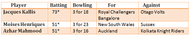 There are only three players who have a half-century and a three-wicket haul in the same match in the history of the Champions League T20. Having scored a 73 not out and picked up three wickets for 18 runs for Royal Challengers Bangalore, South African all-rounder Jacques Kallis, who now represents Kolkata Knight Riders, tops the list.