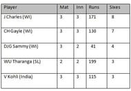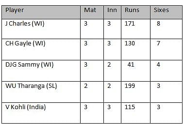 The list shows the most number of 6′s hit by players in the ongoing tri-series in West Indies: