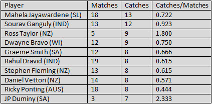Given below is the list of players with most catches taken in ICC Champions Trophy. Mahela Jayawardene tops the list, but the most interesting name appears in this list is that of JP Duminy, who has to his name 7 catches in just 3 matches, roughly translating to a staggering ratio of 2.333 catches per match. Expect him to make climb up the ladder as most of the players in this list have either retired or are in the twilight of their careers.