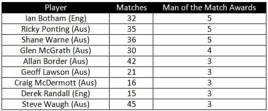 Ian Botham, Ricky Ponting and Shane Warne, all three have won five man-of-the-match awards in the Ashes. Following them is Glen McGrath with four awards. Here’s the list of the cricketers with the most man-of-the-match awards to their names in the Ashes: