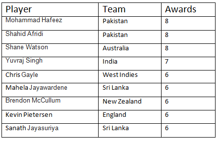Mohammad Hafeez has bagged the most number of Man of the Match awards in T20 cricket, 8. He is followed by team mate Shahid Afridi, who has also won the same number of awards.