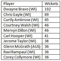 Chris Gayle seems to be making it to every other record list available, holding the second spot on this list too with 69 wickets. Glenn McGrath is the only non-Caribbean player among all the West Indians on the list.