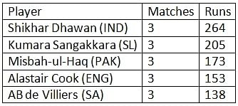 Following the conclusion of the group stage matches in this year’s ICC Champions Trophy, below list shows the batsmen with most runs in the tournament so far. India’s Shikhar Dhawan has been in cracking form and tops the chart with 264 runs so far. Sri Lanka’s Kumara Sangakkara takes the second spot with 205 runs.