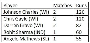 With just 2 matches into the tri-series, below list shows the players with most runs in the tournament so far. Both the West Indian openers – Johnson Charles and Chris Gayle – occupy the 1st and 2nd spot respectively. Rohit Sharma is the only Indian on the list after his resilient 60 in the match yesterday.