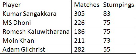 Indian wicket-keeper MS Dhoni moved to joint-second in the list of wicket-keepers with most stumpings in ODI cricket. In the tri-series final against Sri Lanka, Dhoni affected three stumpings which propelled him to join Kaluwitharana, the former Sri Lankan wicket-keeper, on 75 career stumpings. Kumar Sangakkara heads the list with 83 stumpings to his name.