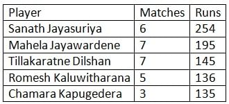 Retired legendary opener Sanath Jayasuriya leads the chart, while Mahela Jayawardene, who is still in the current squad, follows at the second spot.