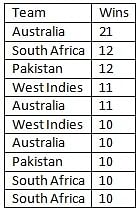 Below is a list showing the teams with most consecutive ODI wins so far. Australia head the chart with 21 consecutive wins during 2003, when Ricky Ponting was the skipper of the mighty Aussie side. South Africa are second on the list with 12 consecutive wins in 2005.