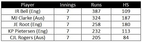 Ian Bell, who has scored 387 in seven innings thus far, is the highest run scorer in the Ashes. Australian skipper Michael Clarke is in second place with 324.