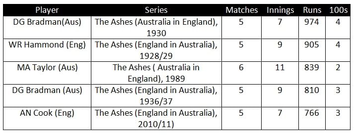 Don Bradman scored 974 runs in the 1930 Ashes, when Australia visited England. Here are the top five run scorers in a single Ashes series.